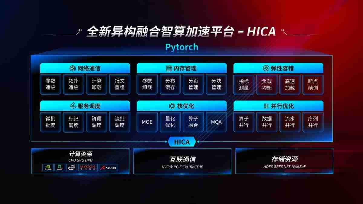 通过自研的服务层、、中间适配层、、以及调度编排算法,,采用数据并行、、、模型并行等多种并行方式,,,把并行计算任务进行有效的分解,,使其分别由相应的软件栈和算力资源来承接。。当GPU资源变化,,HICA可以实时动态调度计算子任务并调整模型拓扑和架构,,,以充分聚合各种算力资源。。。