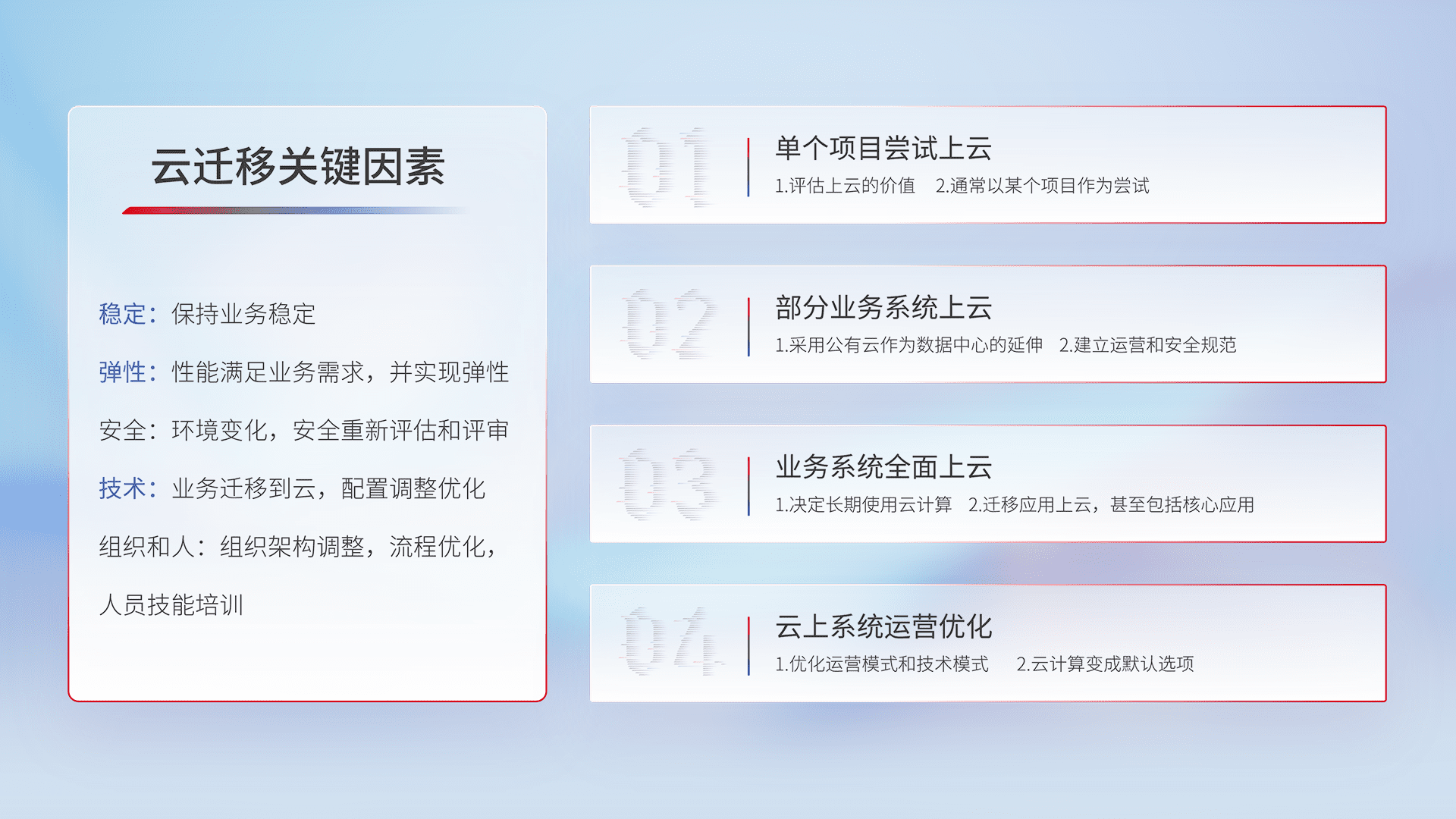 结合实际业务,,,从规划设计、、、云平台选型、、、、云原生改造、、数据迁移、、、、集成交付,,,迁移全过程为客户识别最佳上云路径,,做好风险识别管理,,设计网络架构、、身份权限、、、安全审计合规、、操作审计、、、日志审计、、监控告警策略、、、、多站点容灾设计等,,对云上基础设施进行整体规划,,提升IT治理水平,,,,以满足弹性、、高可用、、高性能的需求。。。