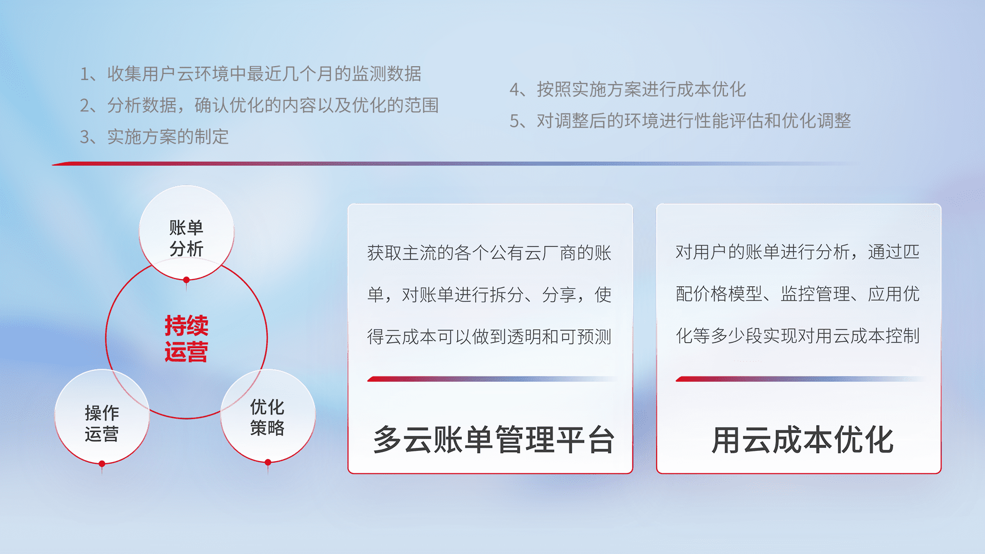 通过多云纳管,,,,以统一的资源数据模型把客户的云资源进行抽象和封装,,,进而实现对多云资源的统一操作,,保障云资源管理的可靠性、、、稳定性与可用性。。量身定制化运维内容,,,配置、、、开发运维、、、、补丁管理、、备份、、、监控、、、认证和访问管理、、、审计和日常巡检等,,,,保障在用云过程中的可靠度,,,稳定度以及高可用率。。。