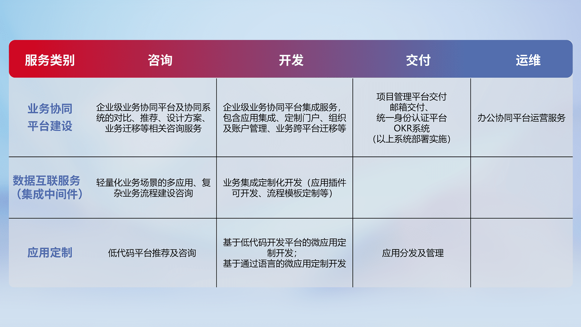 针对钉钉、、、企微、、、、IDaas等平台级产品提供产品的规划、、、方案、、、交付、、定制化开发等服务,,,,实现如统一协同办公、、、智能客户服务、、混合会议管理、、智能数据查询、、、等业务场景,,实现数字化转型。。